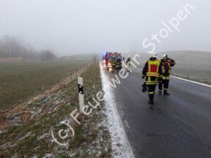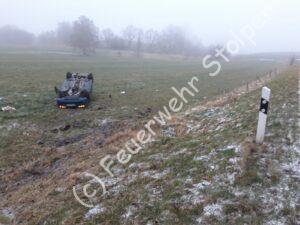 Ein PKW kam von der Strasse ab und landete kopfüber auf einem Feld. Die Person konnte allerdings ohne schweres Gerät aus dem Fahrzeug befreit werden. Wir sicherten während der Rettungsarbeiten die Unfallstelle und halfen beim Transport der Person zum Rettungswagen. Dafür wurde die S 159 kurzzeitig voll gesperrt. Nachdem die Arbeit für uns getan war, und die Polizei ebenfalls eintraf, übergaben wir die Einsatzstelle an die Beamten und rückten wieder ein.