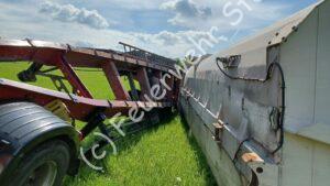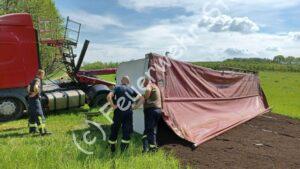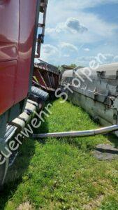 Der Kippauflieger eines Sattelzuges kippte beim Entladevorgang seitlich um. Das zerstörte auch die Hydraulikeinrichtes des Fahrzeuges und Betriebsstoffe ergossen sich über die Wiese, auf der die Entladearbeiten vorgenommen werden sollten. Die Kameraden der Feuerwehr verhinderten eine weitere Ausbreitung im Erdreich. Weiterer Handlungsbedarf bestand für uns nicht. Die Einsatzstelle wurde für den Abtransport des verunfallten Fahrzeuges sowie das Entfernen des kontaminierten Erdreiches an die Polizei übergeben. Verletzt wurde niemand.