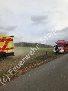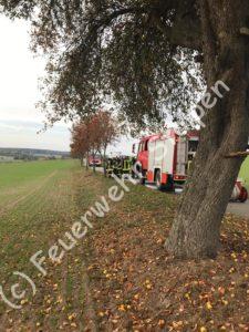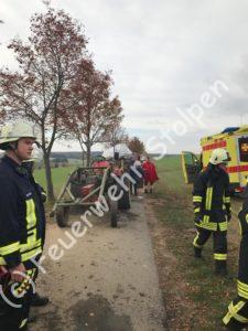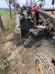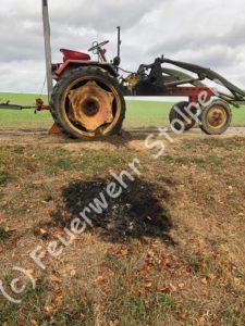 Die Bereifung eines Traktors ging in Flammen auf. Da die Einsatzstelle ausserorts auf einem abgelegenen Feldweg, und ohne nahegelegene Wasserentnahmestelle war, wurden mehrere Fahrzeuge alarmiert. Der Brand konnte dann schnell gelöscht werden, und der Weg wurde von ausgelaufenen Betriebsmitteln gereinigt. Der Fahrer des Traktors, welcher beim Löschversuch giftigen Brandrauch eingeatmet hat, wurde an den Rettungsdienst übergeben.