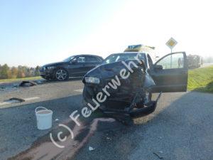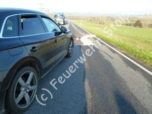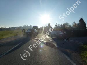 Bei einem Verkehrsunfall wurden drei Personen verletzt. Die Rettungstechnik konnten wir jedoch in den Fahrzeugen lassen. Nachdem die Verletzen an den Rettungsdienst übergeben wurden, reinigten wir die Strasse von ausgelaufenen Betriebsmitteln. Die Strasse musste aufgrund des Einsatzes voll gesperrt werden.