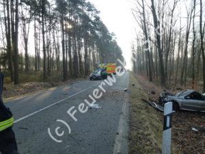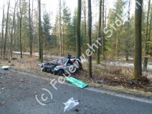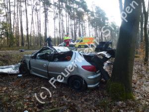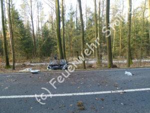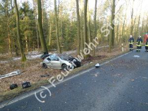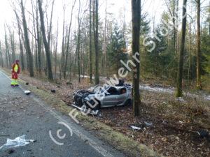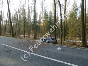 Ein PKW kam von der Straße ab, und krachte mit dem Dach gegen einen Baum bevor er auf den Rädern zum Stehen kam. Aufgrund des Anblickes der Unfallstelle welchen die Anruferin der Rettungsleitstelle schilderte wurden mehrere Einsatzfahrzeuge alarmiert. Die Fahrerin hatte viele Schutzengel dabei, denn sie konnte das Fahrzeug selbstständig verlassen, nachdem die leicht klemmende Tür von außen geöffnet wurde. Die herbeigeeilten Kräfte der Feuerwehr brauchten ihre Technik nicht einsetzen.