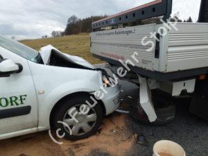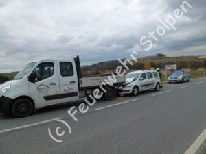 Bei einem Zusammenstoß mit zwei beteiligten Fahrzeugen am Ortseingang Stolpen Richtung Langenwolmsdorf lies die an der Unfallstelle eingetroffene Polizei die Feuerwehr alarmieren da aus einem Unfallfahrzeug Betriebsmittel ausgelaufen waren.