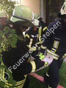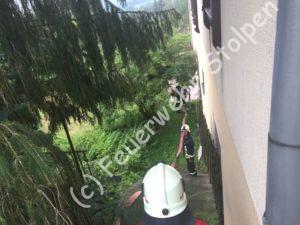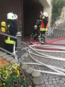 Zügig wurden das TLF und das ELW nachalarmiert, und ein Trupp unter Atemschutz ins Gebäude zur Menschenrettung und Brandbekämpfung geschickt.