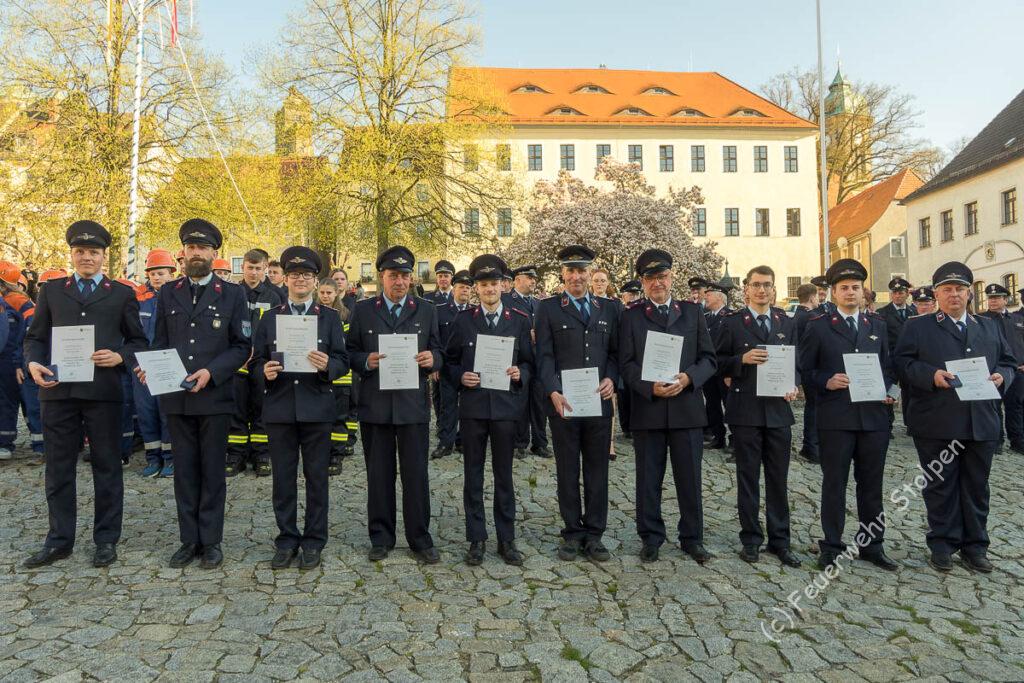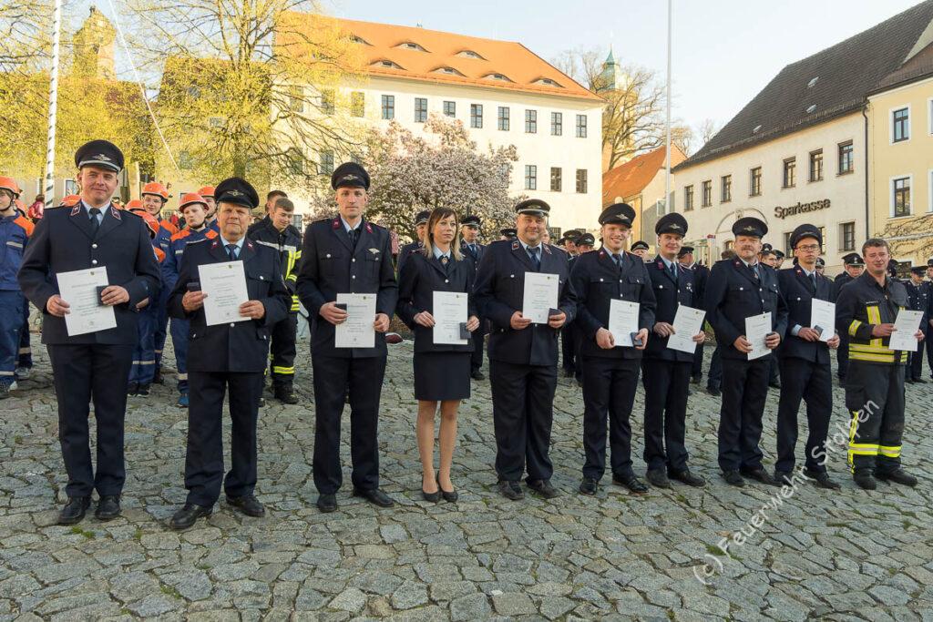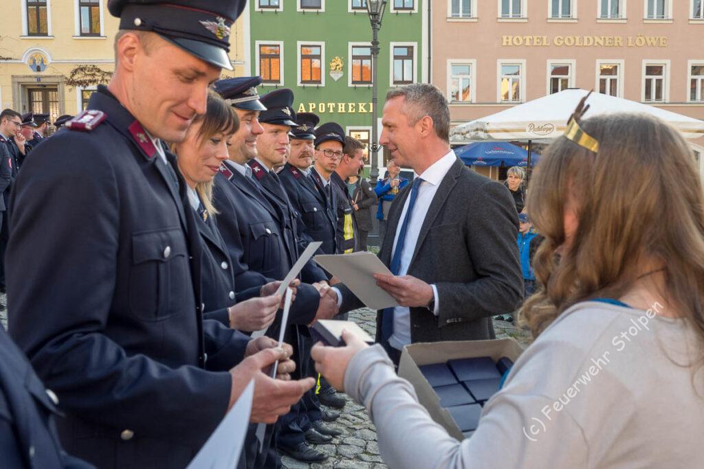Der Bürgermeister nutze die Gelegenheit, das sich fast alle Kameraden versammelt hatten, und überreichte gemeinsam mit unserer Basaltkönigin Medaillen und Urkunden für die vielen Stunden, die wir letztes Jahr in der Sächsischen Schweiz beim großen Waldbrand geleistet haben.