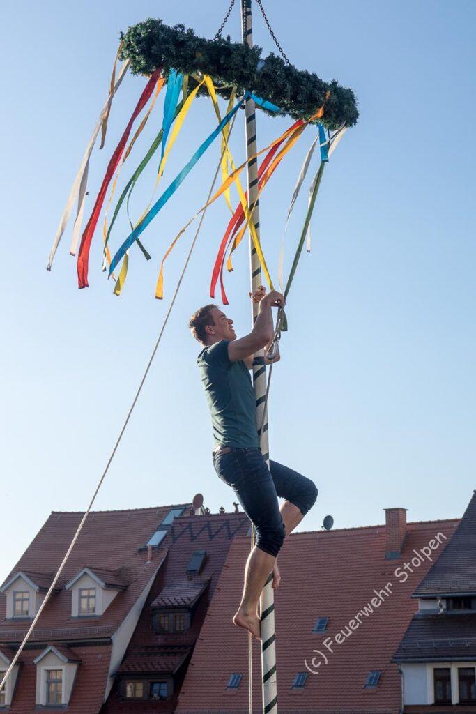 Das wollte dieses Jahr nicht so ganz reibungslos klappen, wie wir das gerne hätten. Erst verfing sich eine Kette des Kranzes, und dieser hing schief, dann wollten die Zugleinen nicht herunterrutschen. Aber auch das gehört dazu. Es kann nicht immer alles klappen und die vielen Zuschauer sahen das genauso sportlich und fair wie wir.