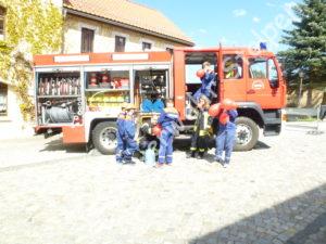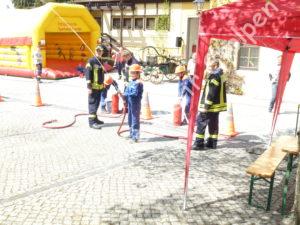 Fiebernd sahen wir dem Beginn der Übung entgegen, die Zeit verging aber wie im Flug. Wir erklärten den Besuchern die Technik, halfen die Kübelspritze zu bedienen, mit der Kinder auf die Fenster eines kleinen Holzhauses spritzen und die dahinter angebrachten Sperrholzflammen ordentlich durchweichten, und halfen beim Kuchenbasar mit.
