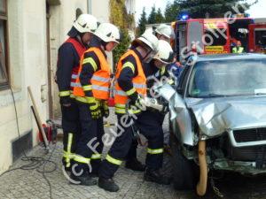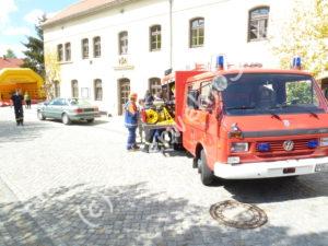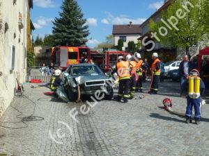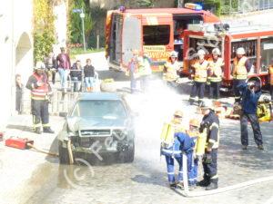 Technik zum Anfassen und Feuerwehr in Aktion war geplant. Die aktiven Kameraden zeigten mit dem TSF-W wie ein verunfalltes Fahrzeug mit Schere und Spreizer soweit zerschnitten werden kann, das die darin befindlichen Personen befreit werden können. Wir durften als Teil dieser Übung mit dem ELW und dem TLF 16/25 zum einen die Einsatzleitung besetzen, und zum anderen das qualmende Fahrzeug löschen.